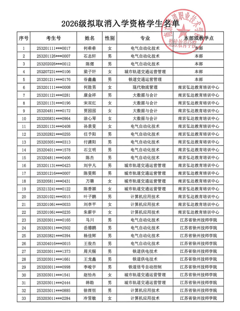 经核查,我院2025年录取的何胜男等33名2026级成人大专考生至今未按入学要求前往我院或我院校外教学点履行报到、缴费注册手续,也未向我院提交任何请假或保留入学资格申请,相关校外教学点也未就此向我院提交有关请假和申请保留入学资格的材料。根据《普通高等学校学生管理规定》(中华人民共和国教育部令第41号)第八条、第十条、第六十六条之规定和《南京铁道职业技术学院成人高等教育学籍管理办法(试行)》第三条之规定,经研究,决定取消该批学生的入学资格,现予以公示。